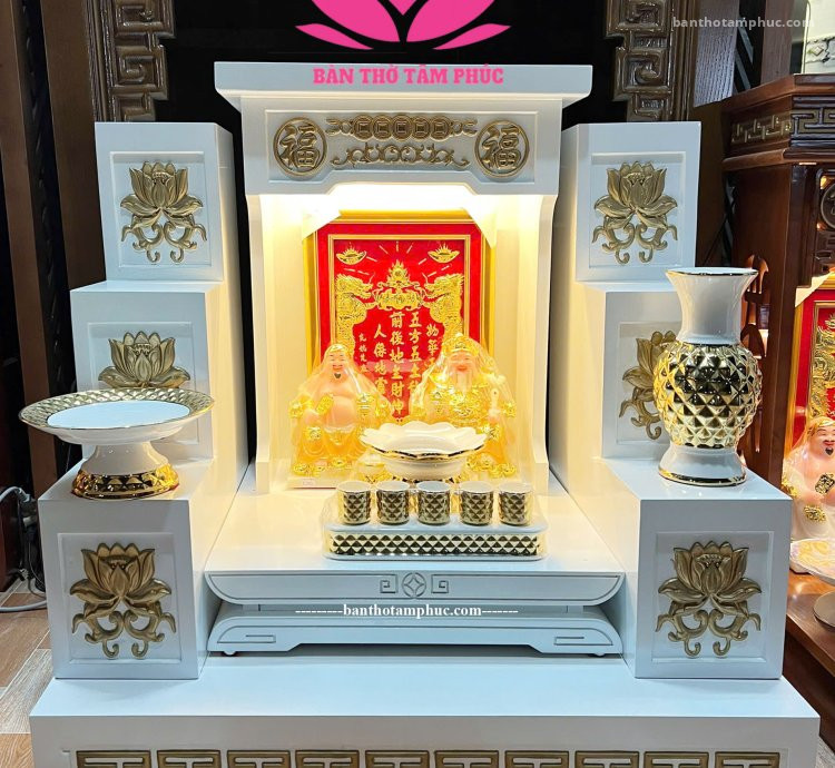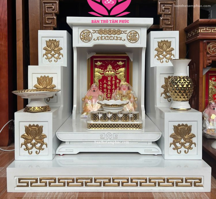Mẫu Bàn Thờ Thần Tài – Ông Địa BD43 là dòng sản phẩm cao cấp tại Bàn Thờ Tâm Phúc, được thiết kế theo phong cách hiện đại và sang trọng với tone trắng – vàng ánh kim nổi bật, giúp tăng cường sinh khí – mang lại may mắn, tài lộc cho gia chủ.